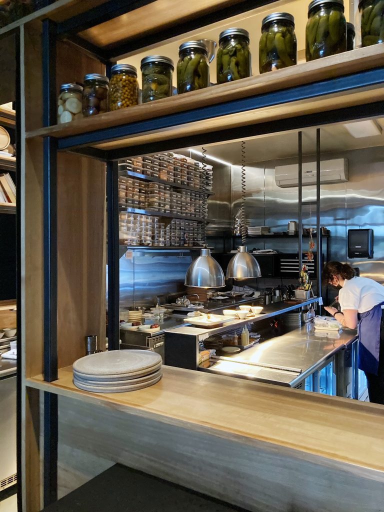 The 22-seat restaurant feels intimate and allows for an exciting view into the kitchen. The shelves are stocked with spices and house-made pickles of any fruit and vegetable you can imagine.