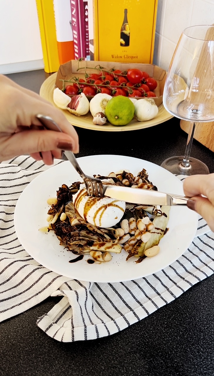 - Plate the endive, radicchio, and cannellini beans and top with the mozzarella di bufula.