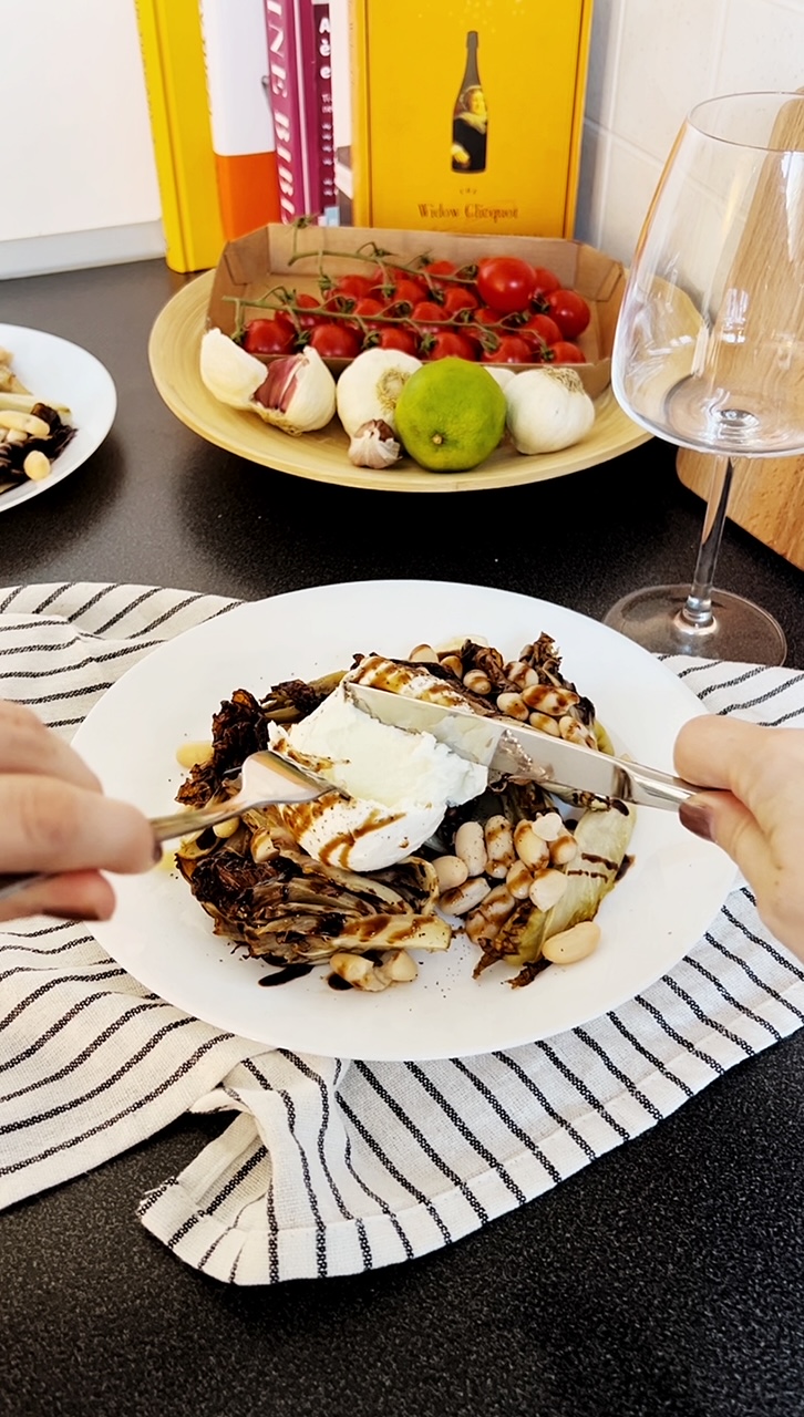 Roasted endive and radicchio, cannellini beans, mozzarella di bufula, and a drizzle of balsamic.