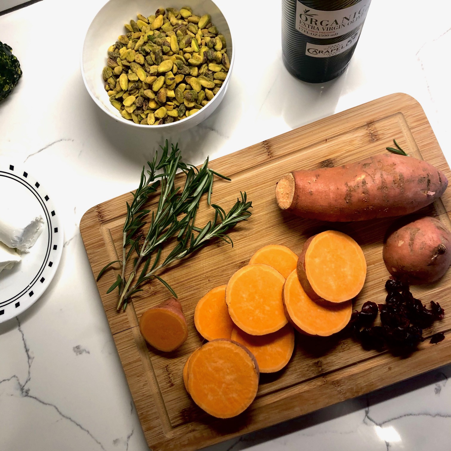 Who doesn’t love dishes with roasted sweet potato this time of year? This delicate yet hearty snack has a foundation of roasted SP, seasoned with rosemary, topped with creamy chèvre–ricotta hybrid, and finalized with some crunchy crushed pistachios. Add in some cranberries and you’re set for a festive Thanksgiving side or light hors d’oeuvres.