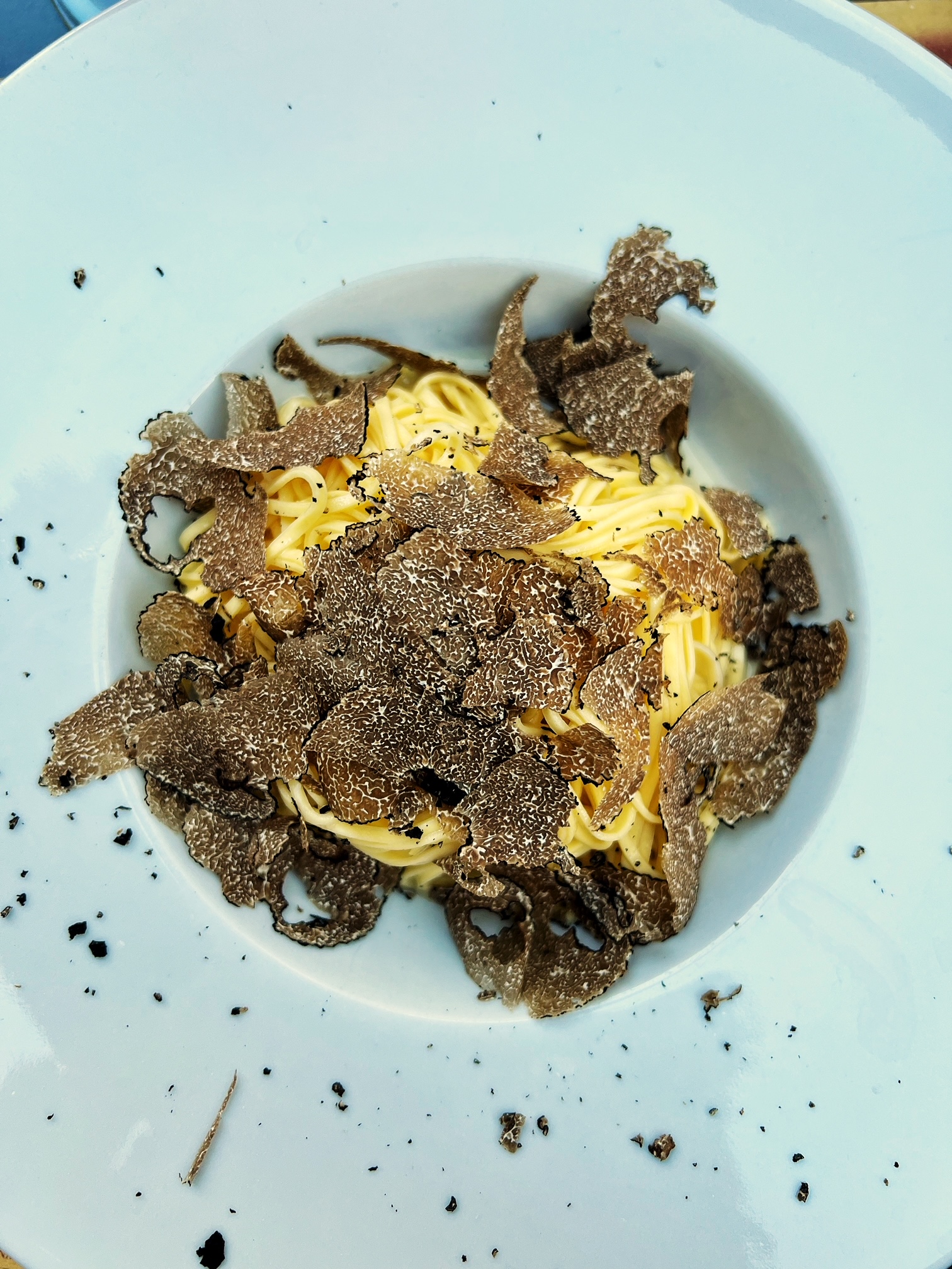I returned back to Alba for dinner before catching a late train home to Milan. The energy had gotten even wilder as evening approached. More people were out and the markets were incredibly active. Street performers and musicians were everywhere. I settled in at an outdoor table at a restaurant on a busy street to enjoy the people watching. Naturally, the entire menu had a focus on truffles. I already knew I’d be ordering the tagliolini with black truffles and with it, a glass of Barolo. Tagliolini with black truffles is the quintessential truffle pasta dish of the area. You’ll see it on a menu as “tagliolini al tartufo”. It’s a simple dish – just tagliolini, a very thin pasta similar to spaghetti, shaved truffles, and a sauce made of truffle-infused butter and Parmesan. Find my recipe for Tagliolini with Black Truffles here.