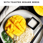 - Mold rice and plate on a dish with the sliced mango, sprinkle with toasted sesame seeds, and serve with a small serving of the reserved sweet coconut cream.